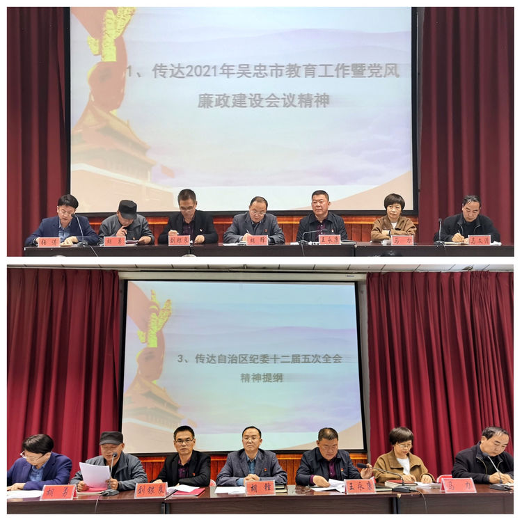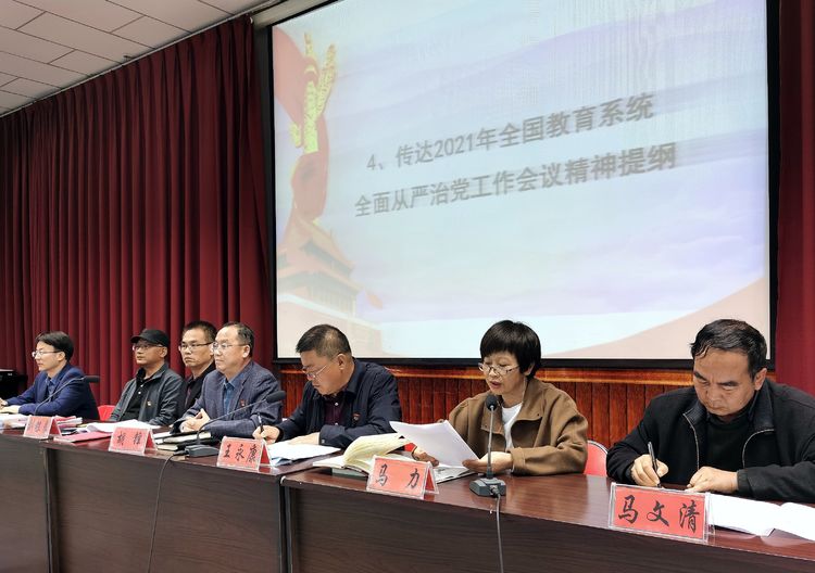 会上,学校党总支班子成员张涛、马文清、胡勇、马力、刘银良分别传达了市教育工委2021年教育工作暨党风廉政建设会议精神、市五届纪委第六次全会精神、自治区纪委十二届五次全会精神提纲、2021年全国教育系统全面从严治党工作会议精神提纲、十九届中央纪委五次全会精神提纲。