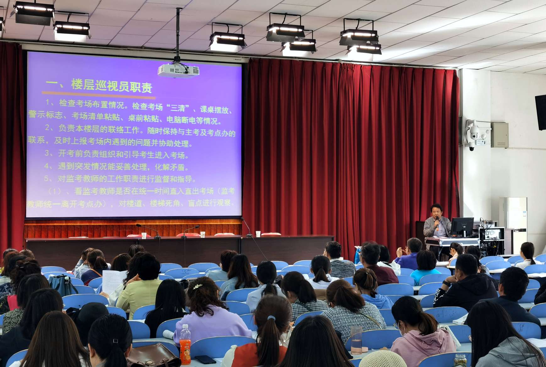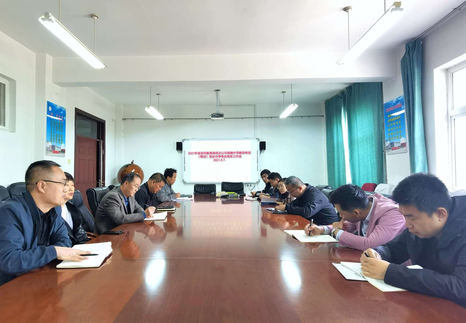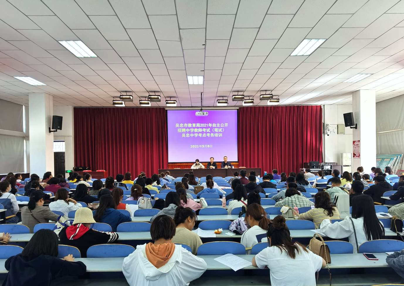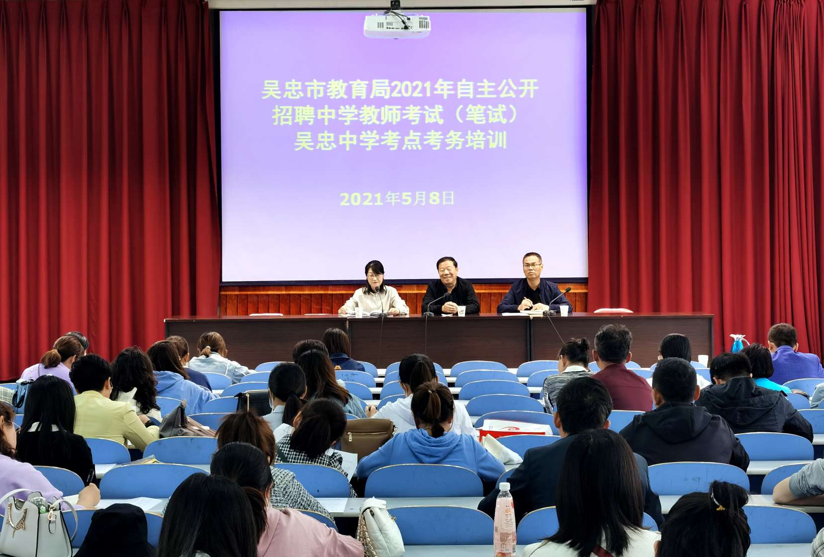 2021年吴忠市教育局自主公开招聘中学教师考试(笔试)于5月9日在吴忠中学顺利举行,我校设有70个考场,考生1970多人。为顺利完成我校考点考试任务,5月7日上午,我校召开了考务工作协调会,校党总支书记、校长胡锋及相关部门负责人参加了会议。胡锋在讲话中说,本次考试是市教育局自主公开面向全国招聘中学教师的一次重要考试,我们要在切实做好考试疫情防控工作的同时,高标准完成各项任务。他对组考工作提出要求,一是确保试卷安全、考试安全、考生安全;二是各负责部门要提高站位、落实责任,分工明确,履职尽责,做好工作,完善流程。