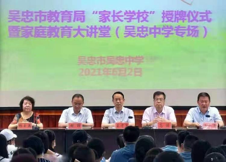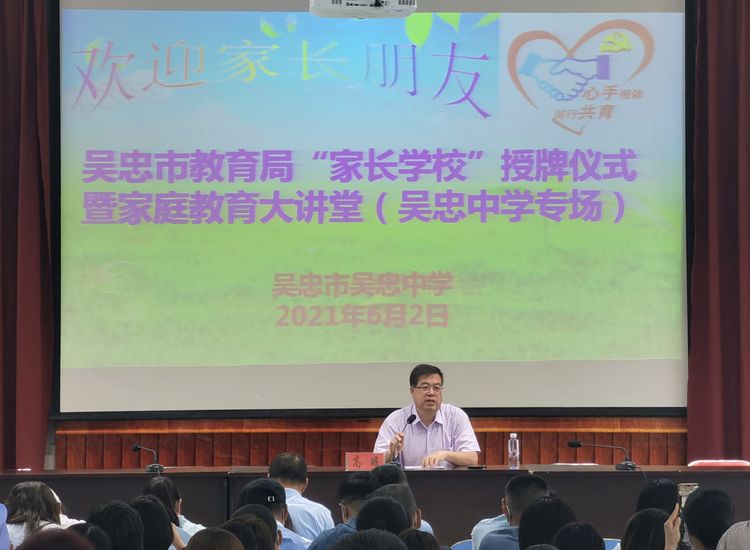 为贯彻落实自治区党委和政府《关于完善校园治理体系提高治理能力的实施意见》和自治区教育厅《关于进一步加强中小学幼儿园家庭教育指导服务工作的实施意见》,大力宣传普及《全国家庭教育指导大纲》和《家长家庭教育基本校外规范》,2021年6月2日下午3:00,吴忠中学举行家长学校授牌仪式暨“蓝绿空间大讲堂”专场活动。
