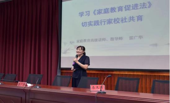 雷广华老师以《学习<家庭教育促进法>,切实践行家校社共育》为主题,向家长们介绍了家庭教育法,并通过一个个生动具体的事例,带领家长们充分认识实施该法的必要性和重要性,运用形象生动的语言和典型事例,深入浅出地讲解了家庭教育对孩子健康成长的重要意义,帮助广大家长明确在家庭教育中的主体责任,引导广大家长做学法、守法、用法的新时代好家长,弘扬和传承中华优秀传统文化,树立“家庭是第一个课堂、家长是第一任老师”的责任意识,真正做一个注重家庭、注重家教、注重家风的好家长,促进未成年人健康成长,增进家庭幸福与社会和谐。雷广华老师的讲座得到家长的热烈欢迎,讲座中实时有掌声响起,家长反映积极,互动良好,受益匪浅,得到了一致好评。