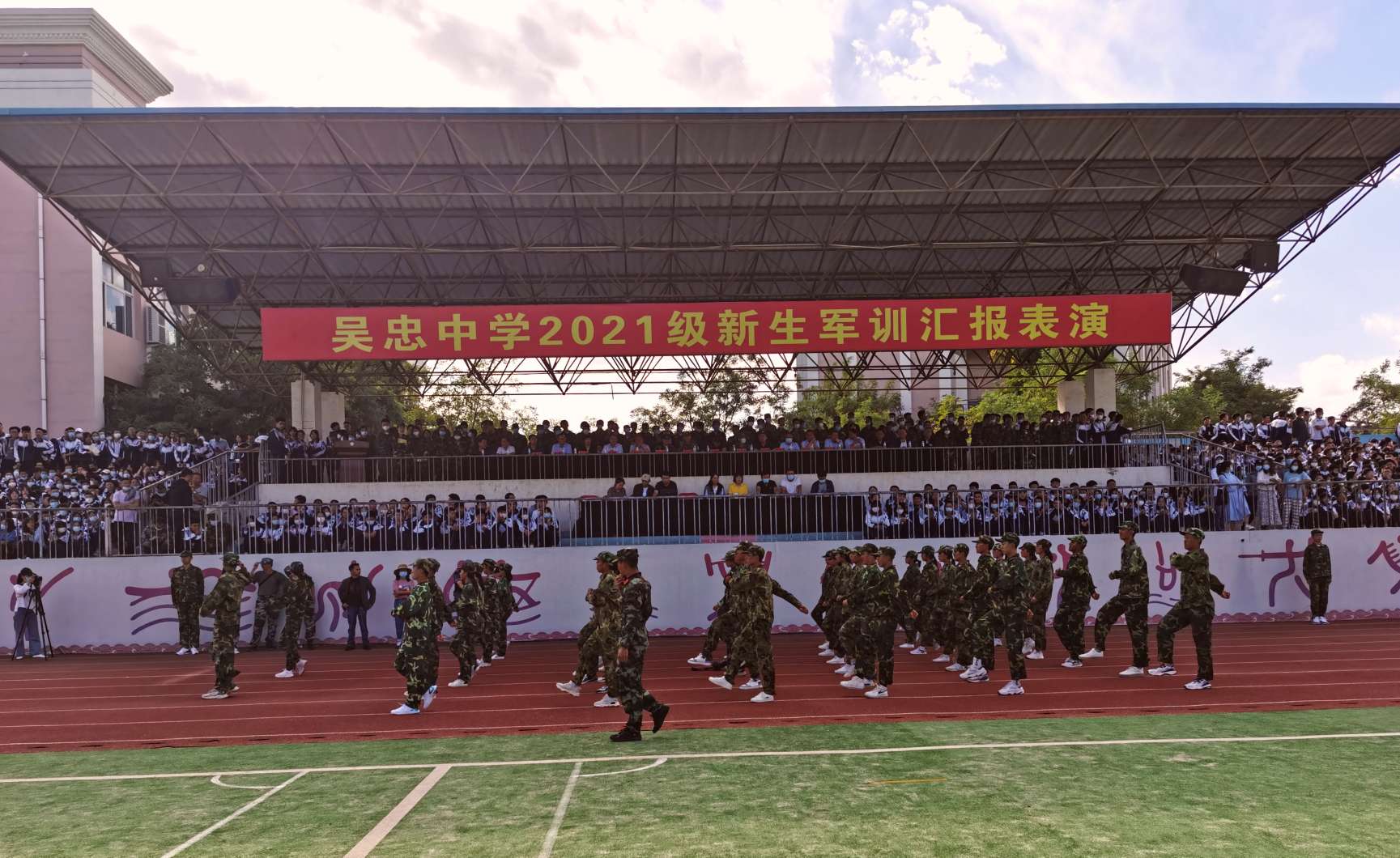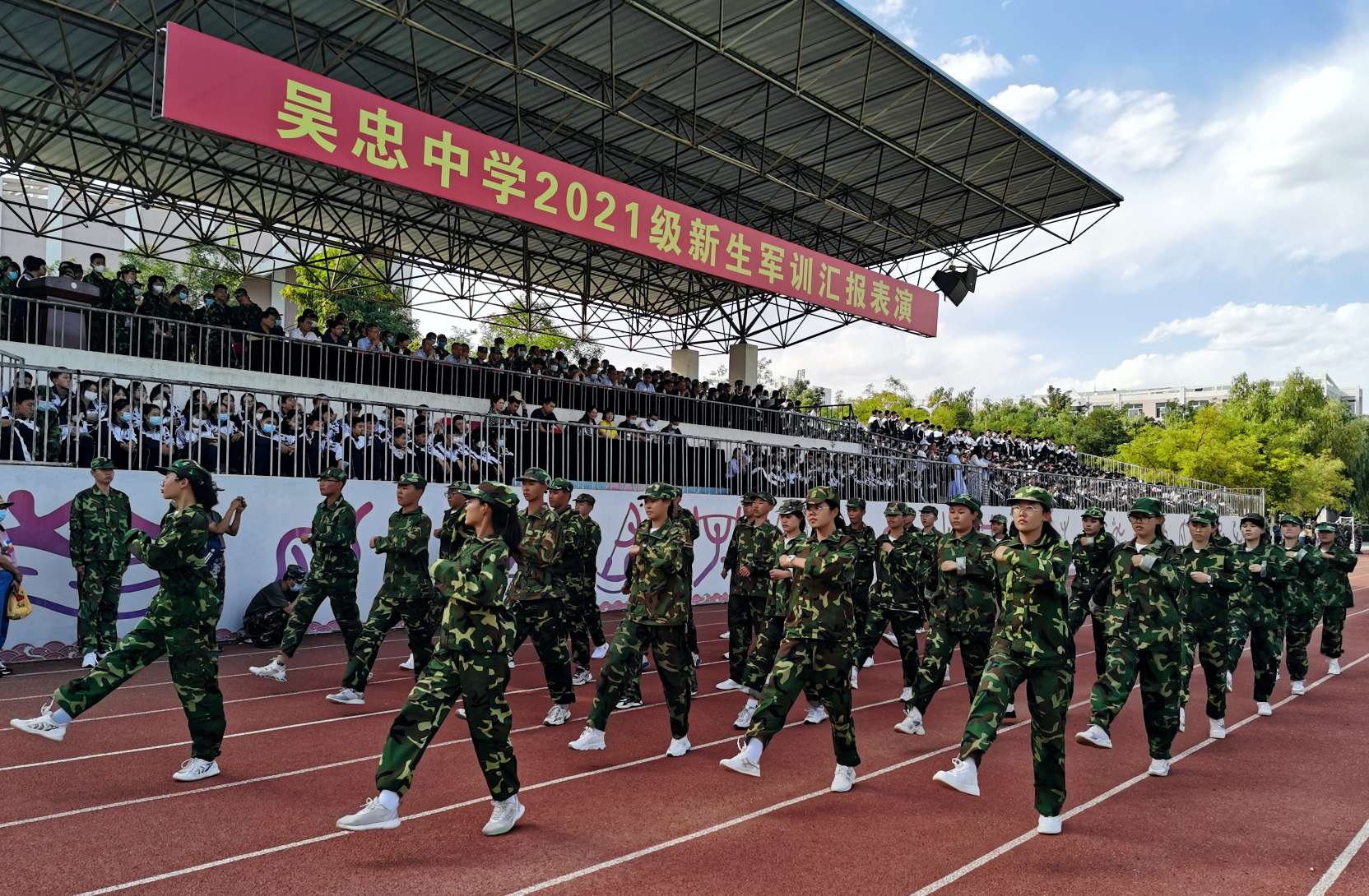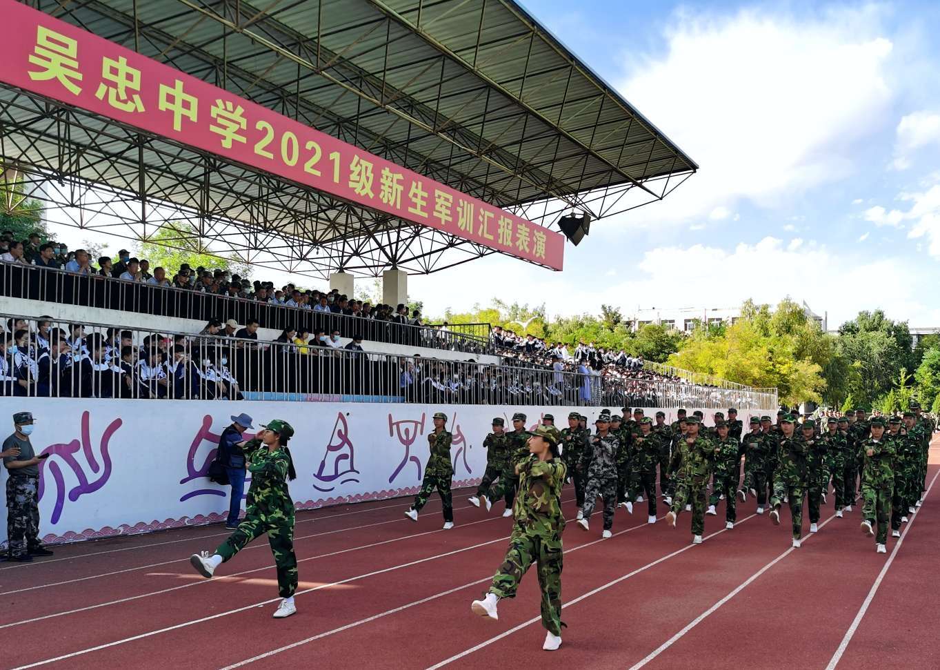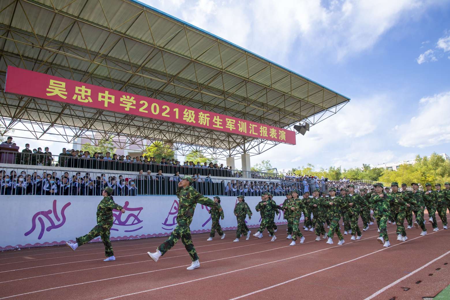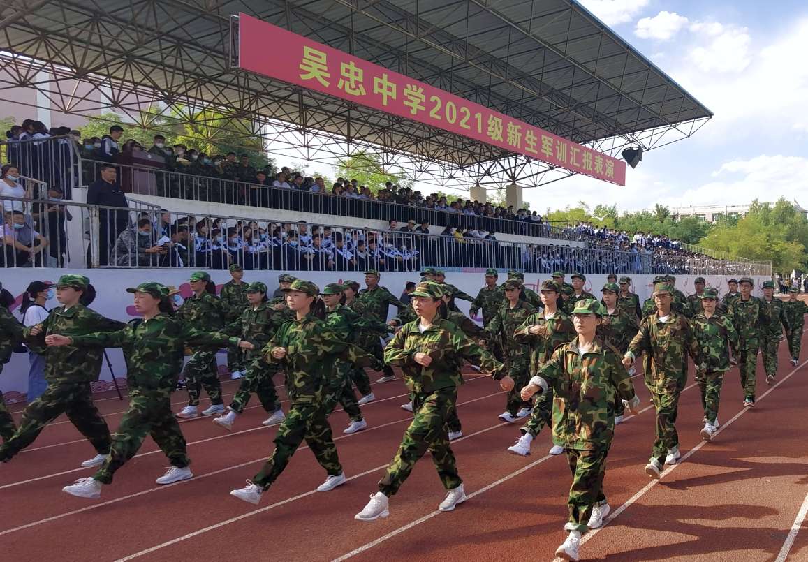 9月8日下午,云淡风轻,天空晴朗,吴忠中学2021级新生军训汇演在嘹亮的国歌声中拉开了序幕。宁夏教育厅、宁夏军区战备建设局、吴忠市委宣传部、吴忠市军分区战备建设局、武警吴忠支队、吴忠市教育局等部门领导及吴忠中学、青铜峡高级中学、吴忠中学初中部相关领导出席了汇报会。校高二年级全体师生、高一年级部分家长观看了汇演。