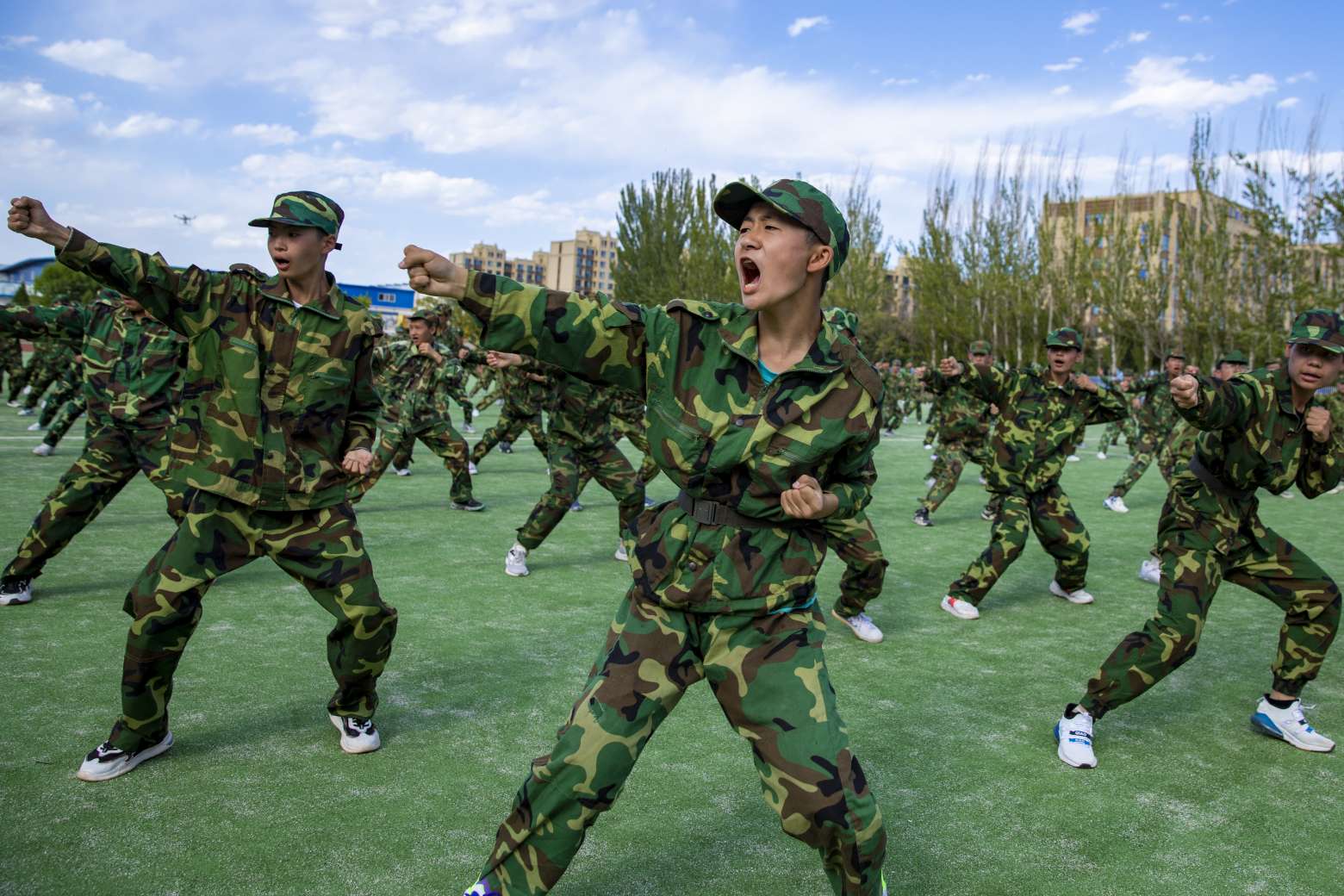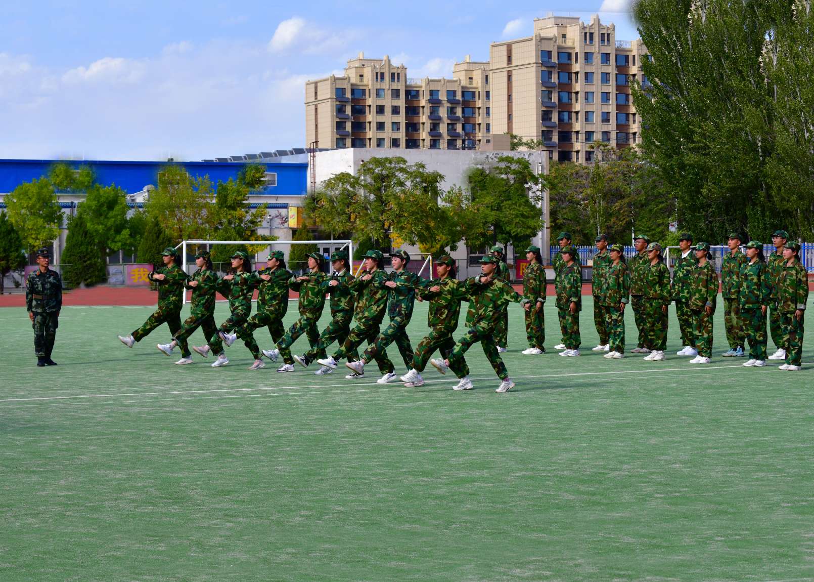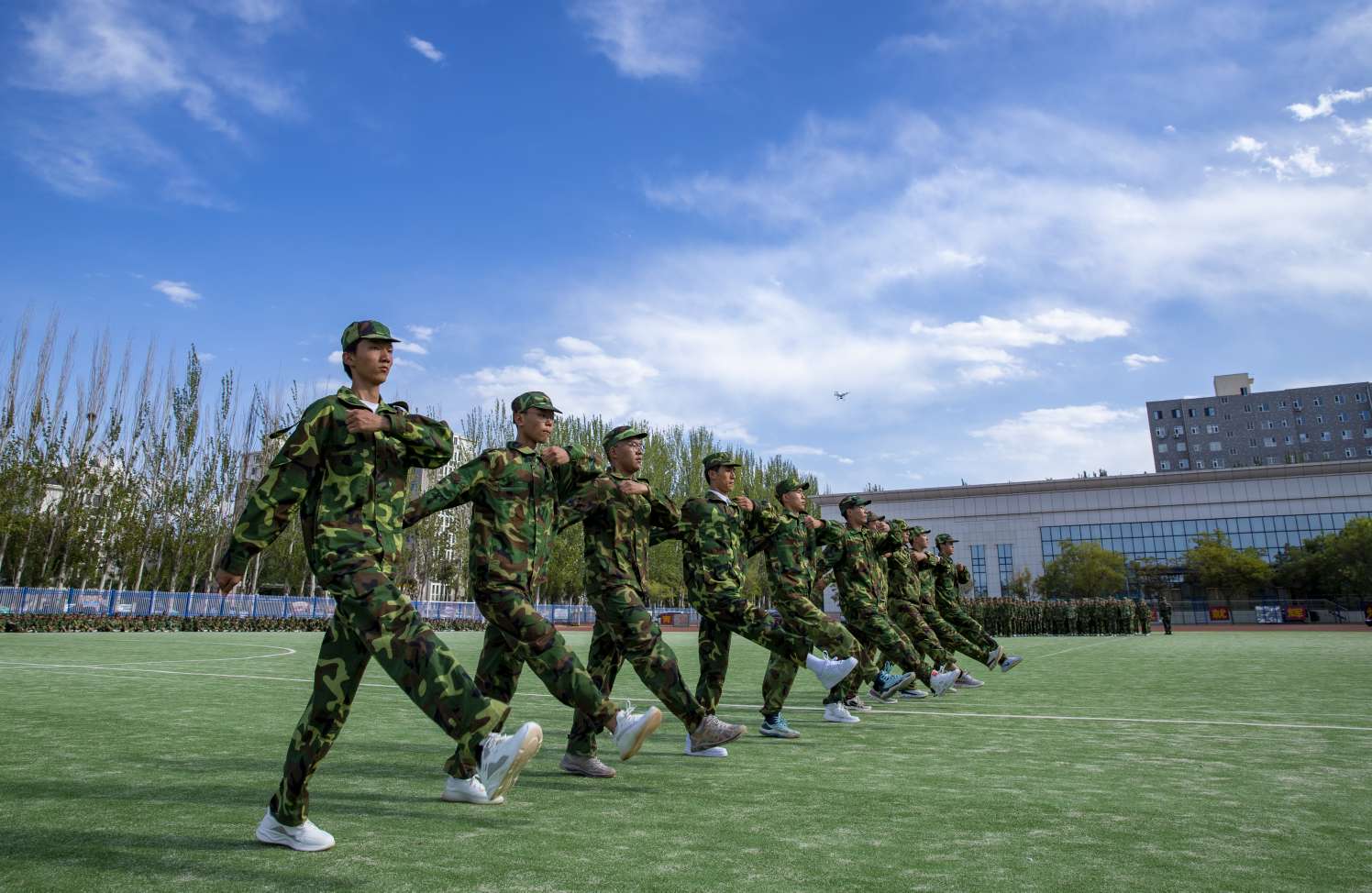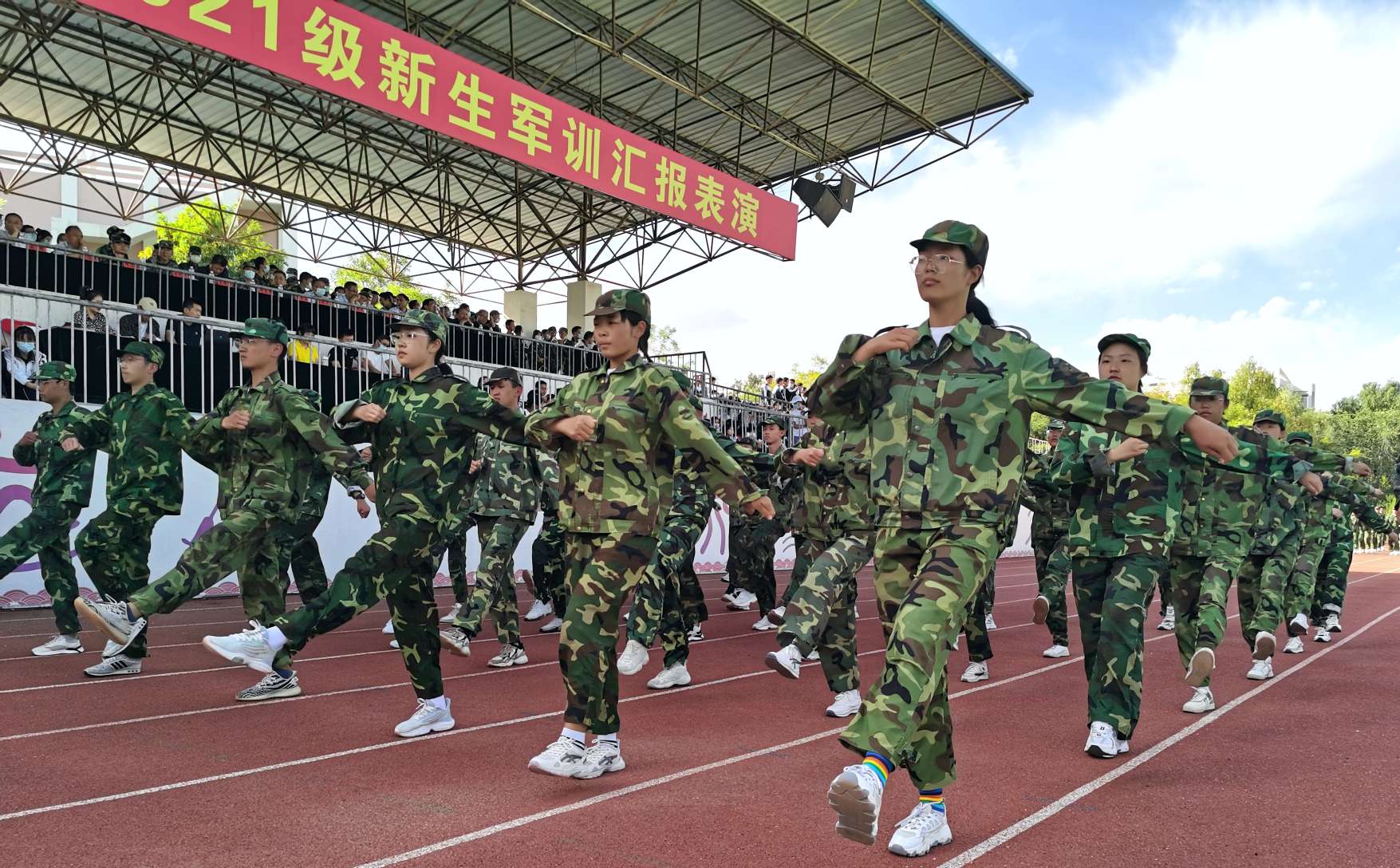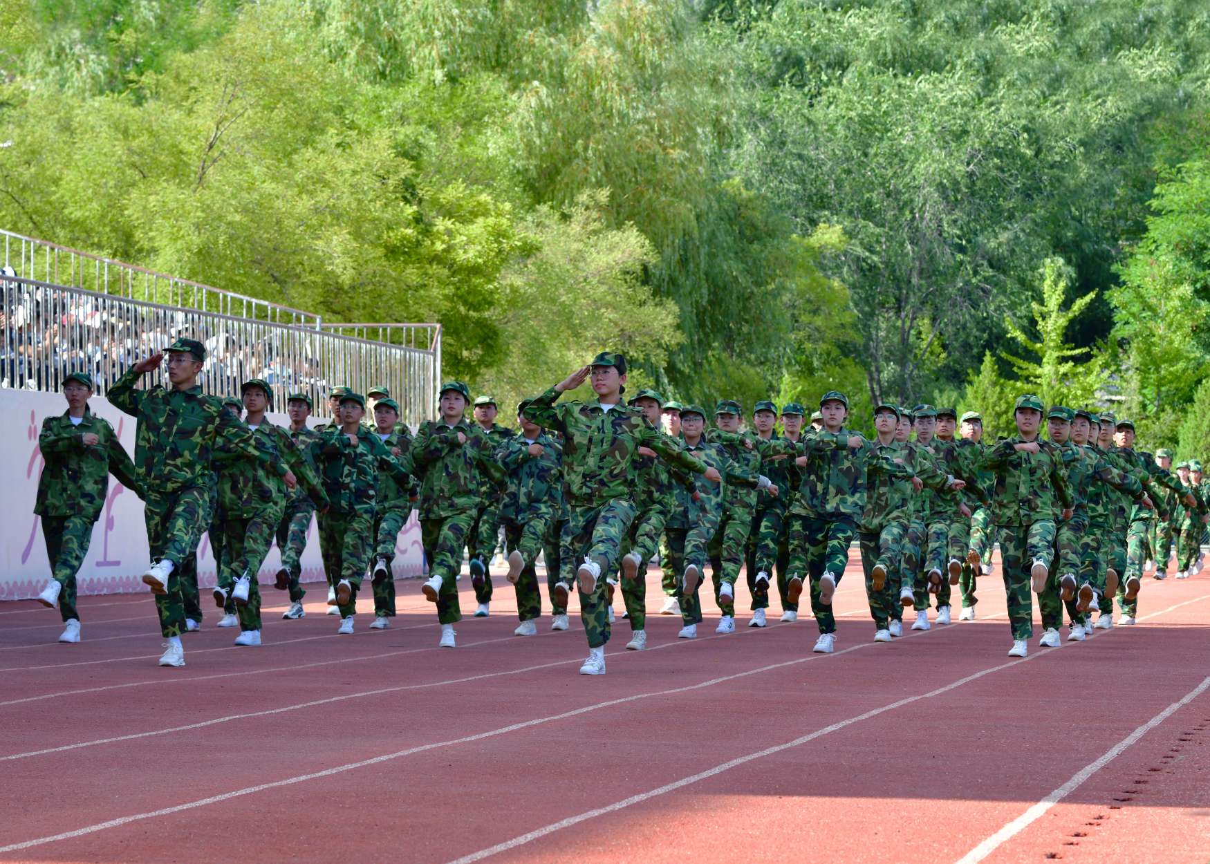 在教官指挥下,高一22个方队精神饱满、口号响亮、步伐整齐,动作一致,向大家展示着军训成果。青春的风貌在红色跑道上得到了完美的呈现,方队的精彩表演赢得了在场所有人的阵阵掌声。