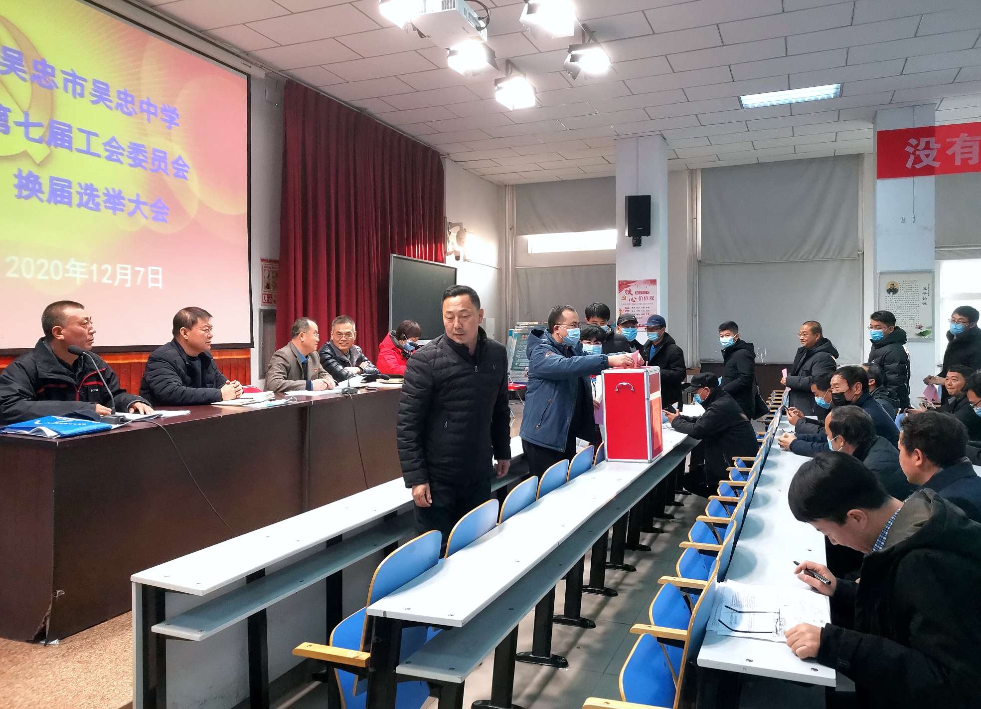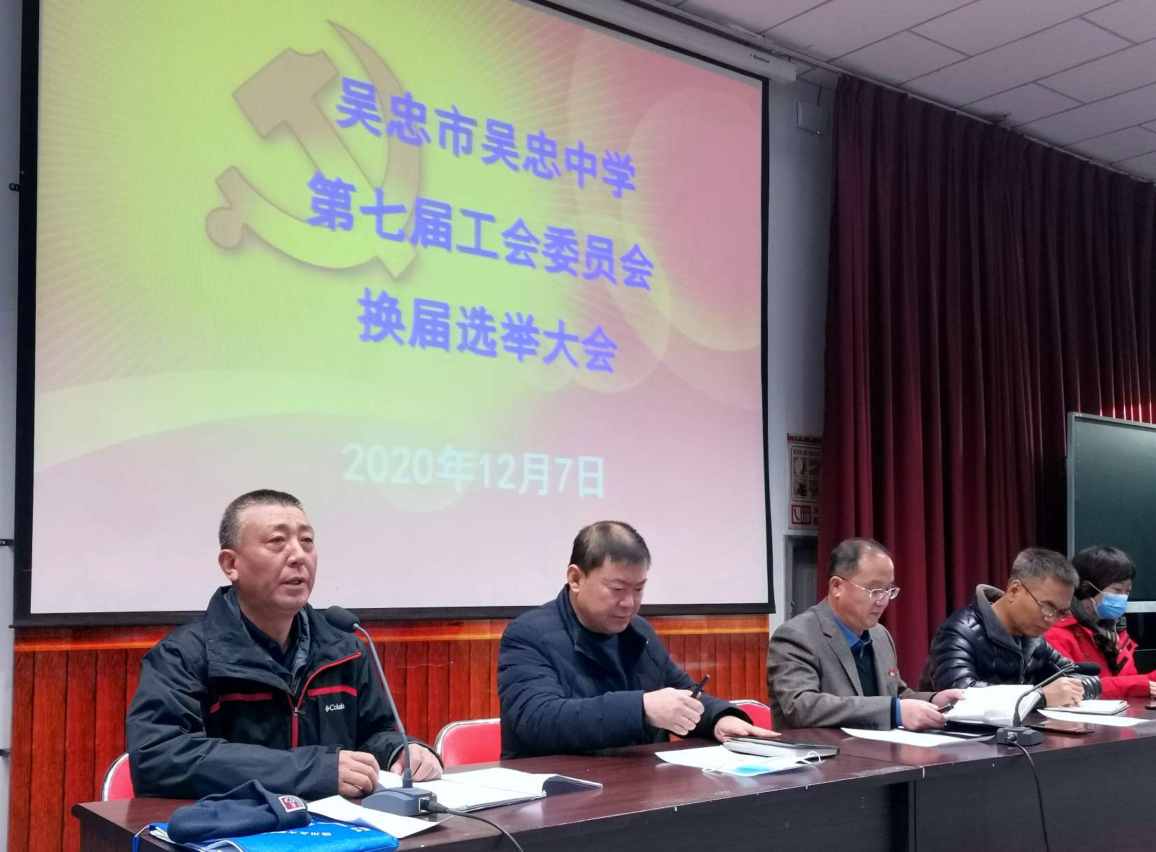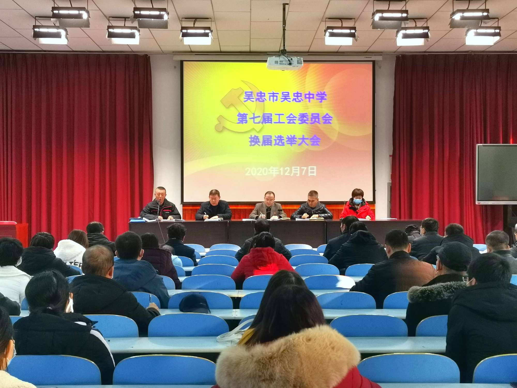 吴忠中学第六届工会委员会在市教育系统工会和学校党总支的领导下,团结全校教职工,为学校的教育教学工作和学校的发展做了大量的工作,根据《中华人民共和国工会法》,第六届工会委员会任届期满,经学校党总支2020年11月18日会议批准,11月19日报请市教育系统工会同意批复,于12月7日下午召开了第七届工会委员会换届选举大会。大会在庄严的国歌声中拉开了序幕。
