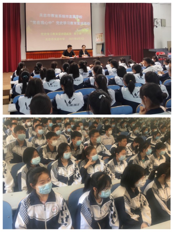 按照吴忠市教育局党组关于“党在我心中”党史学习教育宣讲活动第一阶段安排,6月3日下午,市教育系统党史学习教育宣讲团成员、吴忠中学朱少华老师在办公楼一楼开展党史宣讲,380余名学生聆听了讲解。